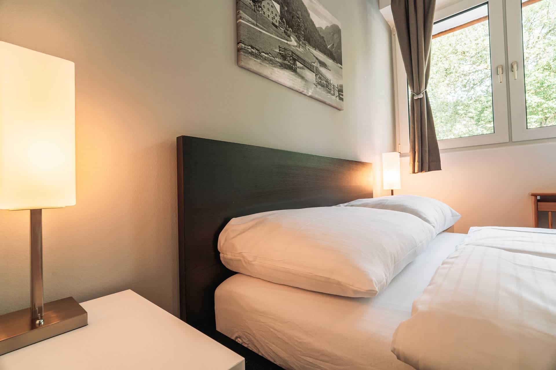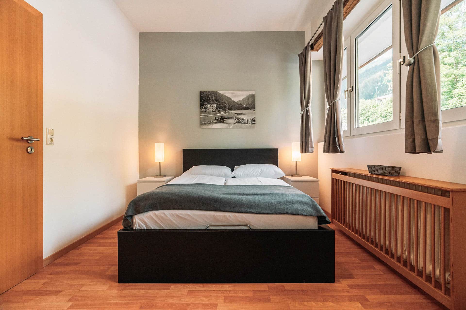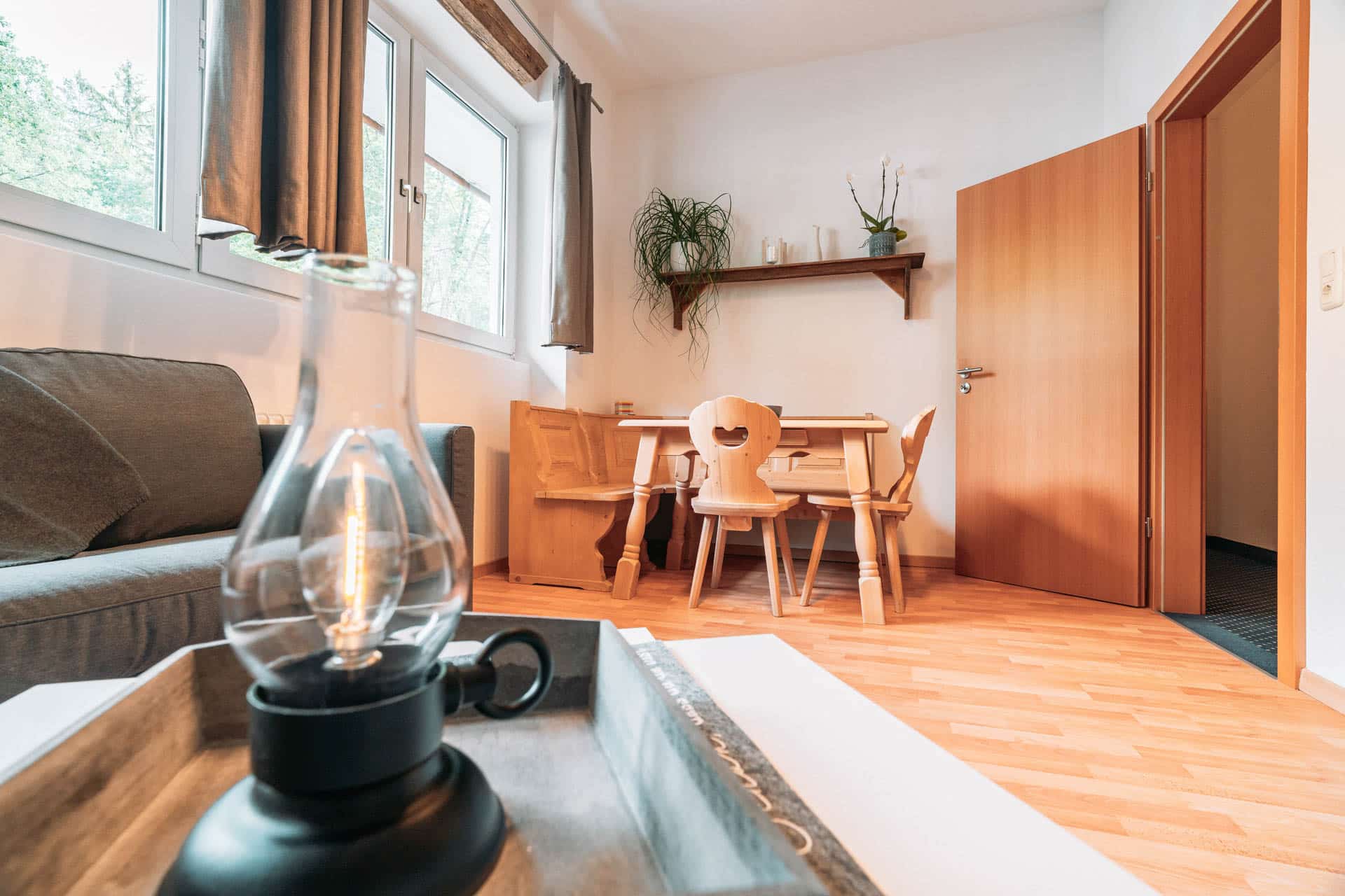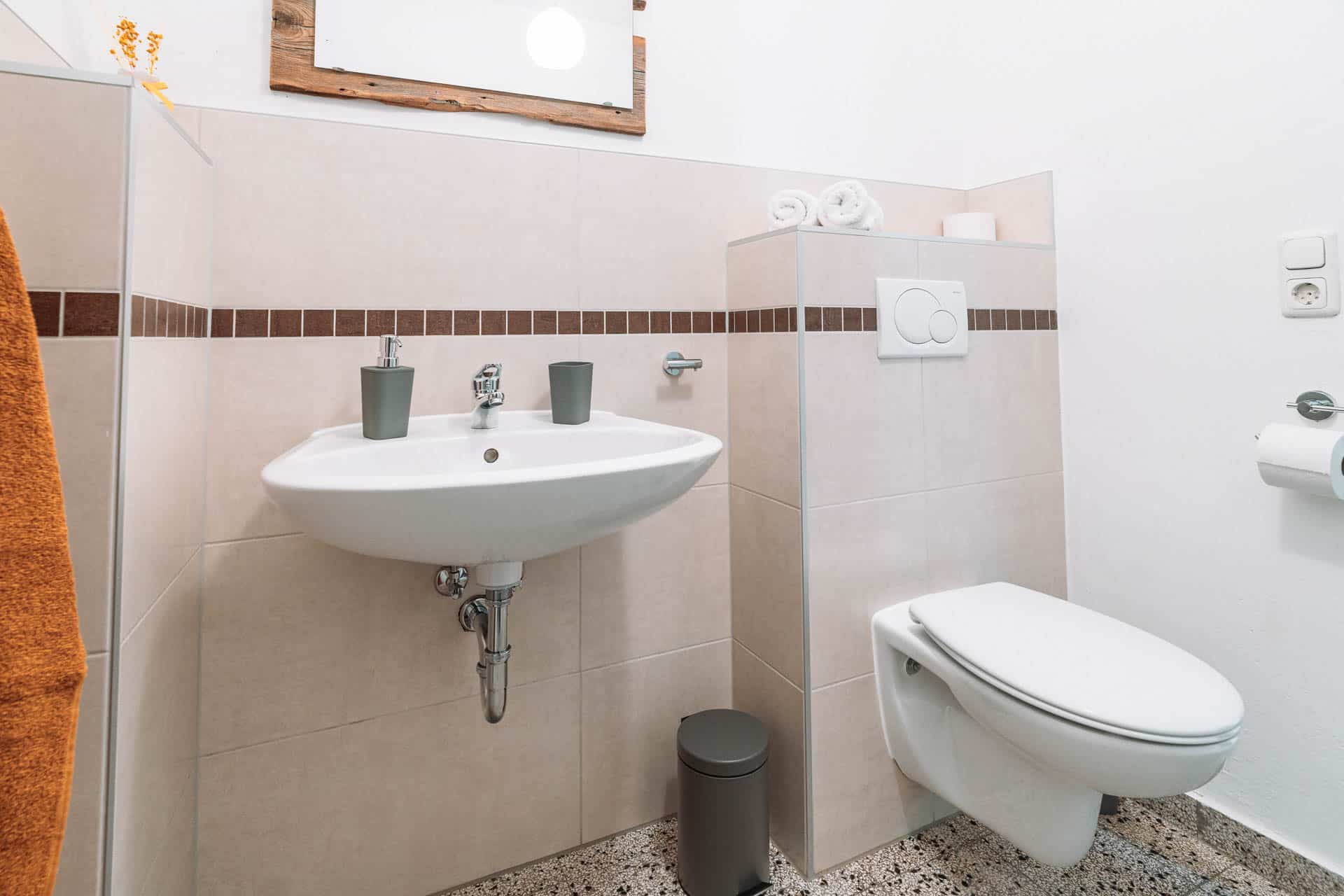 Ausstattung: Geräumige Ferienwohnung mit separatem Eingang, die neu renovierte Wohnung hat ein Wohnzimmer ausgestattet mit Sitzmöglichkeit und einem Fernseher. Ein Schlafzimmer mit Doppelbett (160×200) und großer Schrankwand, die als Abgrenzung zum Bad und Waschbecken dient. Im weiteren Schlafzimmer befindet sich ein Doppelbett (120×200). Separates Bad mit WC, Waschbecken und Dusche.