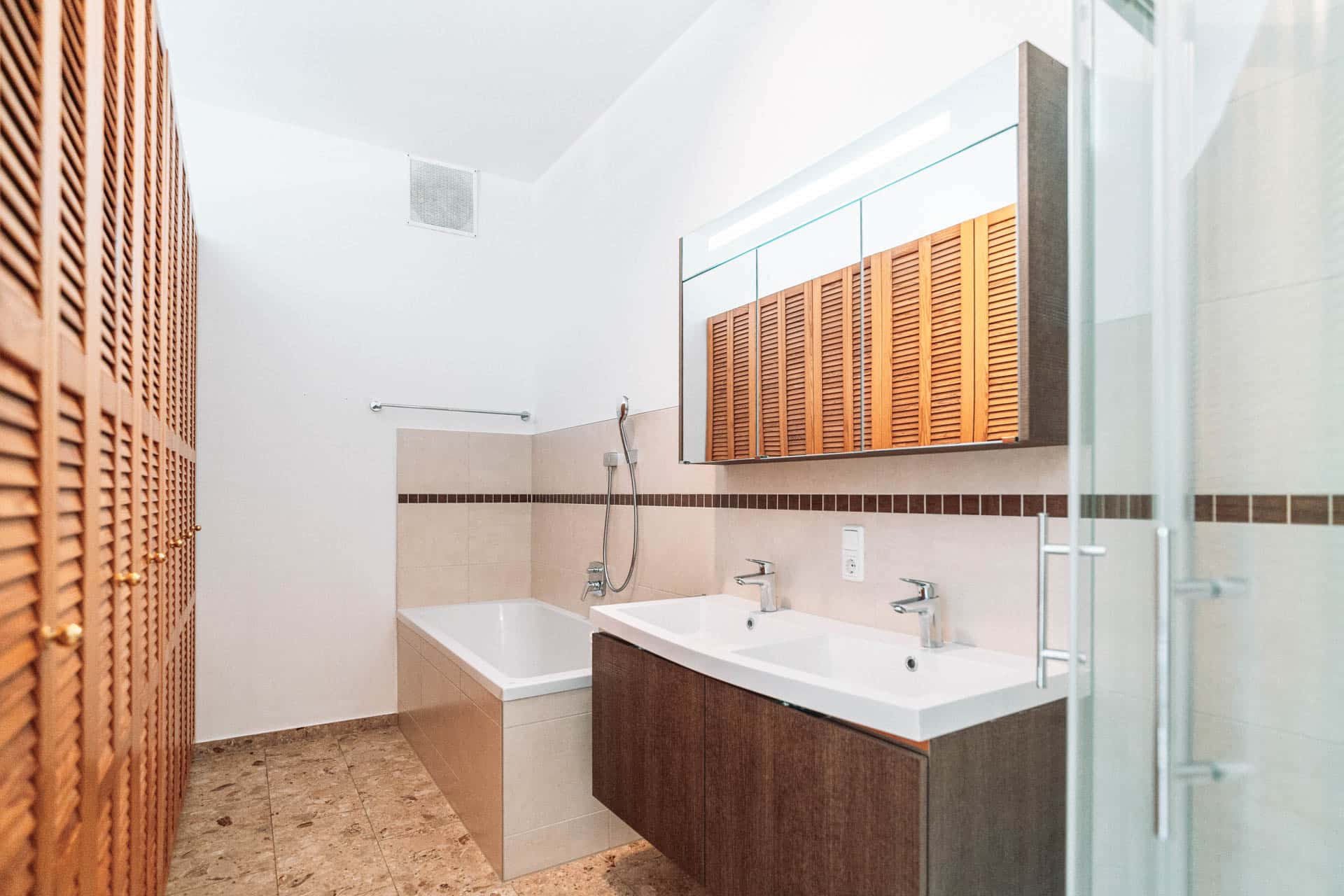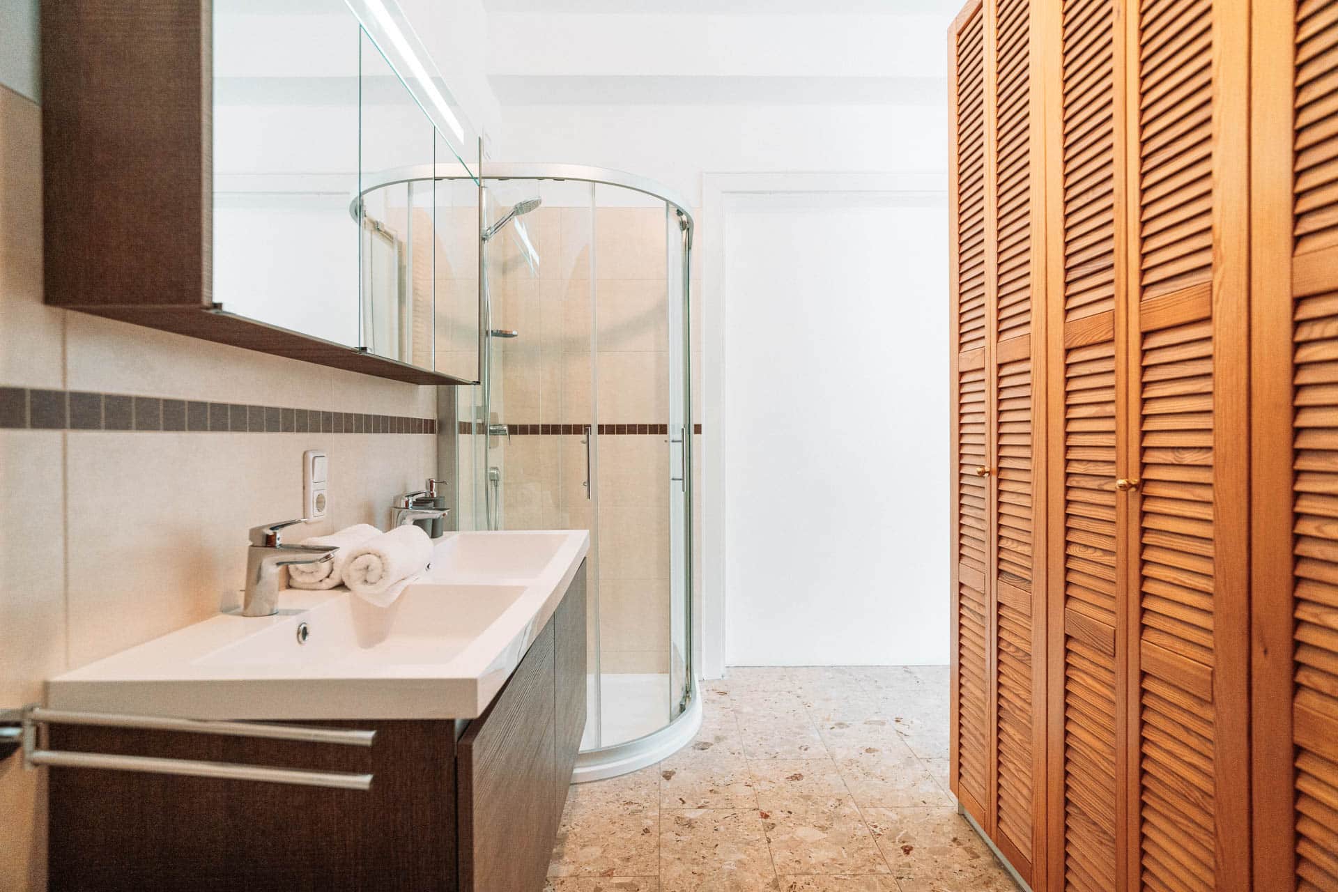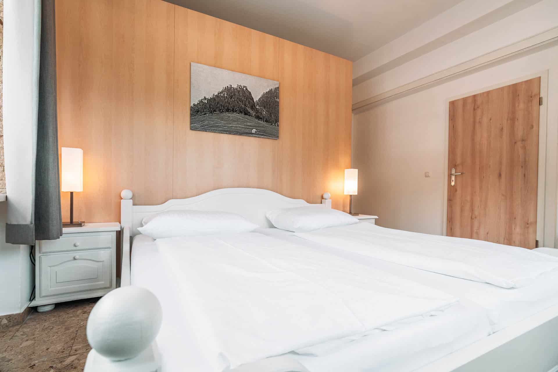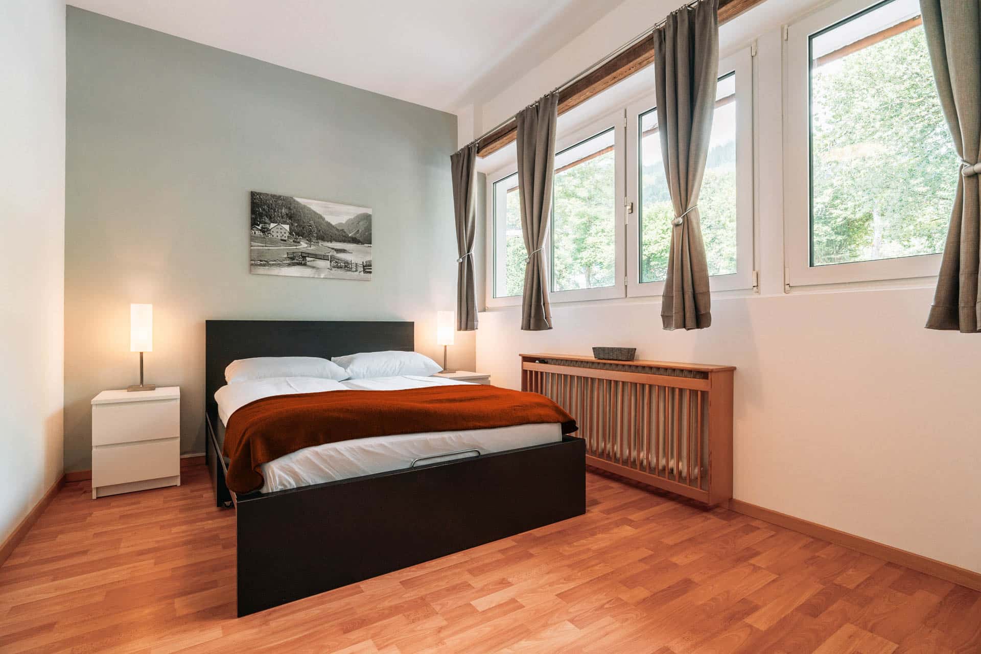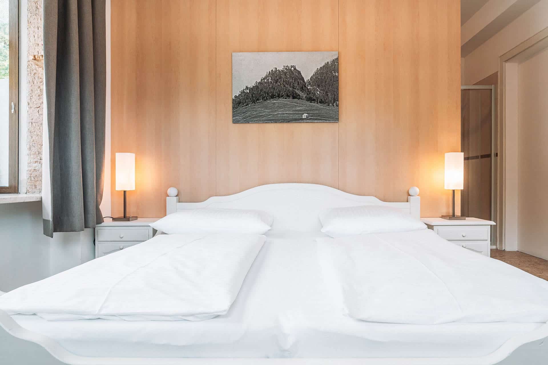 Ausstattung: Geräumige Ferienwohnung mit separatem Eingang, die neu renovierte Wohnung hat ein Wohnzimmer ausgestattet mit Sitzmöglichkeit und einem Fernseher. Ein Schlafzimmer mit Doppelbett (160×200) und großer Schrankwand, die als Abgrenzung zum Bad und Waschbecken dient. Im weiteren Schlafzimmer befindet sich ein Doppelbett (120×200). Separates Bad mit WC, Waschbecken und Dusche.